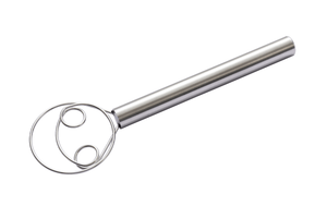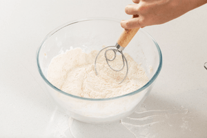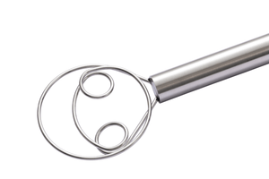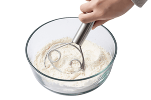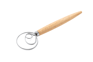 The dough whisk comes in two styles, boasting a crafted wooden handle or a sleek stainless steel handle, which fits securely and comfortably in your hand. Three professional-grade stainless steel hoops of differing diameters form the business end of this unique piece of equipment. Those fancy-looking hoops are the secret to the whisk's effectiveness; the flow-through design has only 5% of the surface area of a regular mixing spoon. This enables you to whisk quickly but with less force so your ingredients are more evenly combined (and your arm won't get as tired!).